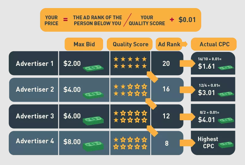 ส่วนลำดับของการโฆษณานั้นจะขึ้นอยู่กับจำนวนเงินสูงสุดต่อการคลิก (Maximum Cost Per Click) ที่เราพร้อมจะจ่ายให้กับทาง Search Engine โดยยิ่งกำหนดจำนวนเงินสูงมากเท่าไรก็จะยิ่งดันอันดับการโฆษณาของเว็บไซต์ให้ขึ้นสูงขึ้นตามการอัดฉีดเงิน