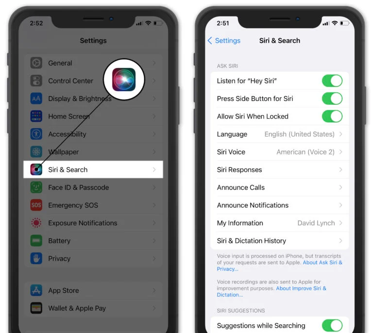 (Listen for Hey Siri, Press Side Button for Siri, Allow Siri When Locked)