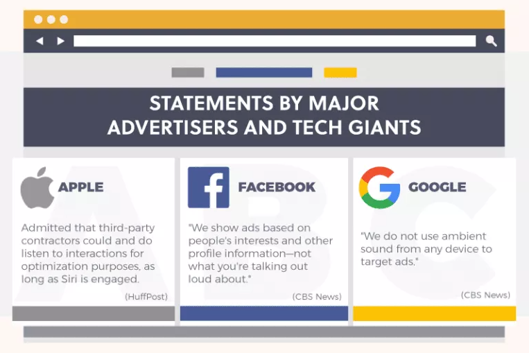 ส่วนทาง Google และ Facebook ก็ได้ออกมาประกาศว่าทางบริษัท "ไม่เคย" ใช้งานไมโครโฟนเพื่อการ "โฆษณา" แต่อย่างใด
