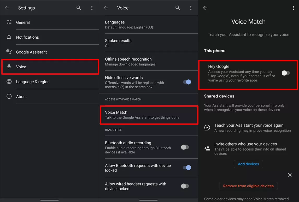 - เลือกที่ "เมนู Voice Match" แล้วเลื่อนปิดการเรียกใช้งาน Google Assistant ด้วยการพูดว่า "Hey Google" และแตะที่ "Remove from Eligible Devices" เพื่อลบข้อมูลการใช้งาน Google Assistant